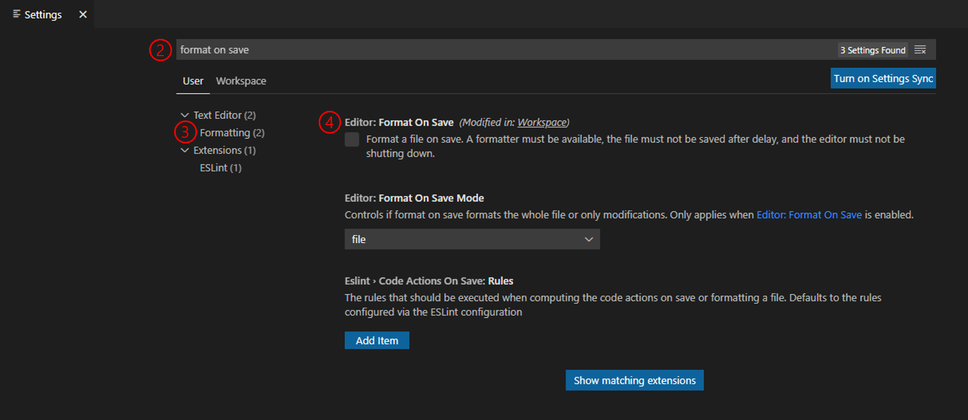 - format on save 를 검색한다.